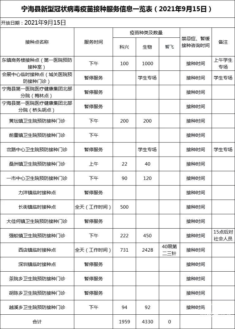 【宁海县新冠疫苗种接服务信息(20210915)】