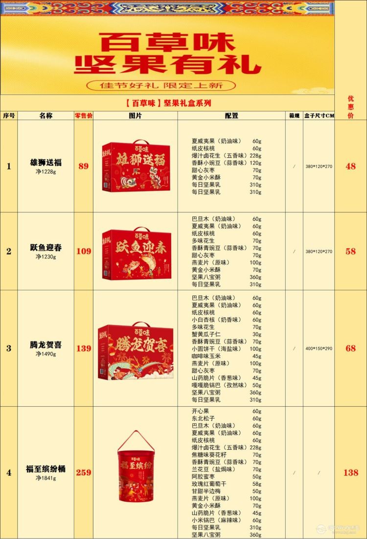 年底福利怎么选? 既要体面有品牌,又要实用好分发,还要预算可控、员工喜欢这份【2026年货员工福利采购合集】,直接帮你一次配齐【坚果零食】 年货刚需,人手一份不踩雷三只松鼠、百草味、来伊份、良品铺子、洽洽、沃隆、味滋源、姚生记、臻味、如水、阿明、三胖蛋、葵珍、天喔【卤味·腊味·熟食】 过年就要有“肉香”乐品上海、周黑鸭、双汇、张飞牛肉、王小卤、科尔沁、无穷、久久丫、紫燕、雨润、西贝、煌上煌、皇上皇、小胡鸭、万有全、邵万生、金华火腿、东来顺清真、宴小柒、萨啦咪【米面粮油】 最稳妥的员工福利王炸克丽娜、特诺娜、纳福汇橄榄油、燕之坊、对口扶贫礼包、五谷磨房、金龙鱼、鲁花、胡姬花、贝蒂斯、纳福汇、北大荒、海天、山茶油、中粮、禾煜、乔府大院【糕点零食·巧克力】 年味+幸福感拉满美心、费列罗、雀巢、蓝罐、瑞士莲、明治、皇冠、歌帝梵、大白兔、冠生园、旺旺、徐福记、进口食品、澳门永辉、好想你、乐奈、三关六码头、江中猴姑、好丽友、德芙、盼盼等【海鲜·肉类·高端生鲜】 高端福利首选梦婕、徐妈妈、甬城鲜、海鲜猫、新岸线、玄武记、舟山海鲜、光明、品尊轩、渔老板、海狸先生、盐池滩羊、三文鱼、獐子岛海参、醉蟹、小龙虾、原切牛肉、牛排、牦牛肉、和牛、梅花鹿肉、科尔沁、爱森【滋补·蜂蜜·茶·酒·乳品】 照顾全家人的健康方家铺子、正官庄、雷允上、同仁堂、胡庆余堂、阿胶、燕之屋燕窝、五谷磨房、老金磨坊、小罐茶、红酒洋酒、官栈燕窝花胶、佛跳墙、花胶鸡、黄天鹅、蜂蜜、张一元、中茶茶叶、新宝堂陈皮、白酒、星巴克、Costa、伊利蒙牛、佳果源、德亚、茅台、百果园【节庆礼盒·老字号·酒店款】 高端定制不失面子昇阳泰、赵大有、味滋源、美心、锦华、华美、稻香村、广州酒家、85度C、COSTA冰淇淋月饼、澳门英记、大董、大蓉和、迪士尼、东来顺清真、法蒂欧、锋味派、歌帝梵、功德林、故宫、关茶、官栈、冠生园、哈根达斯、汉礼、好家乡、好利来、集味轩、荣华、开心礼、立家非遗、良品铺子、榴芒一刻、迈硕奢品、麦轩、明玥、奇华、洽洽、荃盛、荣诚、三只松鼠、十月初五、松鹤楼、唐饼家、陶老大清真、陶陶居、五芳斋、喜来顺清真、鲜品屋、香港半岛、香格里拉、新雅、星巴克、杏花楼、轩妈、玉佛寺、元朗荣华、元祖、臻味上新了故宫、知味观、诸老大、紫光园清真、至尊帝皇、希尔顿、洲际、万豪、威斯汀、雷迪森、嘉禾月、粮午斋、同庆楼、丁山河、汉礼、西贝、百草味、金九、安琪、全聚德、潘祥记、美荻斯、米旗、北稻、宫里造物【生鲜·杂粮·调料·熟食·养生全覆盖】生鲜类:南纬三七牛排、盐池滩羊、牛羊肉、富硒黑猪肉、东来顺生鲜、华光海鲜、烧烤礼盒、星龙港海参、伯纳德、牧将杂粮山珍:卡宴杂粮、大米、藜麦、山珍调料类:艾贝拉橄榄油、亚麻籽油、山茶油、福临门米面油大礼包熟食类:清真东来顺、天福号、清真月盛斋、卡宴腊味、周黑鸭、中粮梅林午餐肉礼盒休闲类:集味轩坚果、美荻斯坚果、集味轩糕点、美心蛋卷、锦华糕点、歌帝梵巧克力、昐昐大礼包鸭蛋蜂蜜:卡宴鸭蛋、蜂蜜防暑降温:清凉一夏大礼包、德亚牛奶/饮品、新京堂养生茶养生类:好想你-枣、卡宴银耳/燕窝、杞果兄弟、福牌阿胶、首粮五谷粉、西麦麦片 企业员工福利 / 年货集采 / 定制搭配 / 一件代发 预算可控|品牌齐全|省心省力 买年货,找金刚\/:kingkongblack