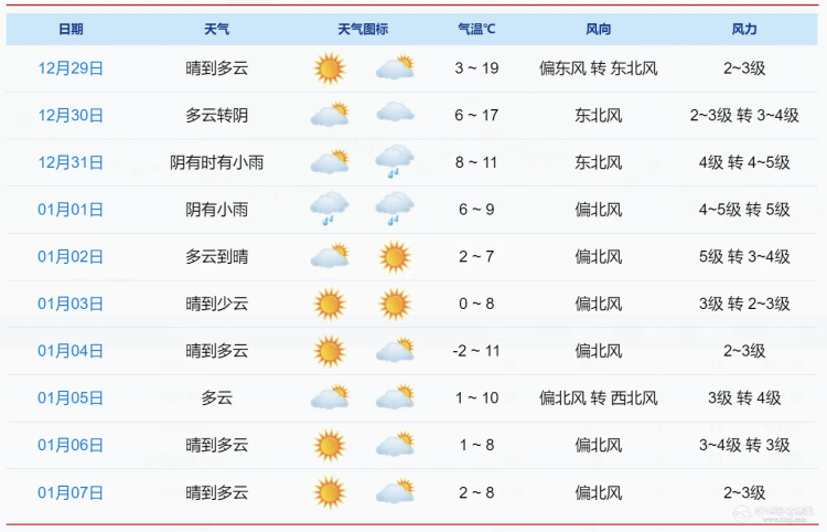 1月1日随着冷空气主体南下,最高气温跌至10℃以下,最低降至6℃左右,2日起天气虽然转晴,但气温依旧低迷,最低在2℃,有薄冰或冰冻,山区-4~-8℃,有严重冰冻。
