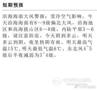 沿海海面大风警报:受冷空气影响,今天沿海海面有8~9级偏北大风,沿海地区和高海拔山区6~8级,内陆平原5~6级,请注意防范。今天阴到多云,明天多云到阴,夜里转阴有雨。明天最高气温15℃,明天最低气温6℃。东北风4~5级后半夜减弱为3~4级。